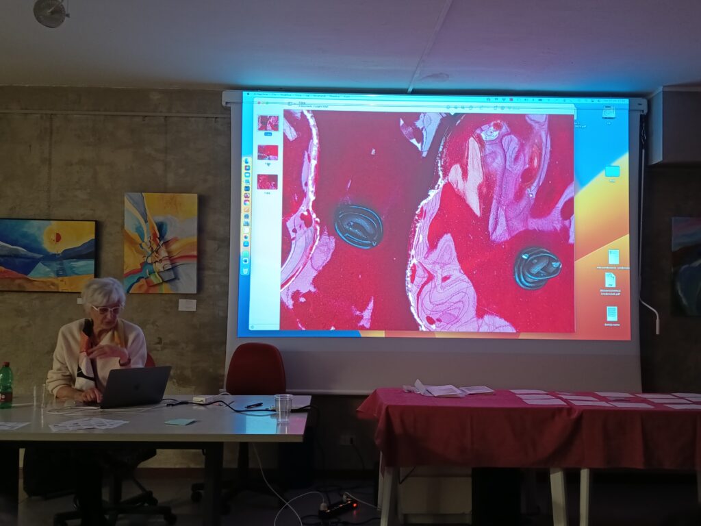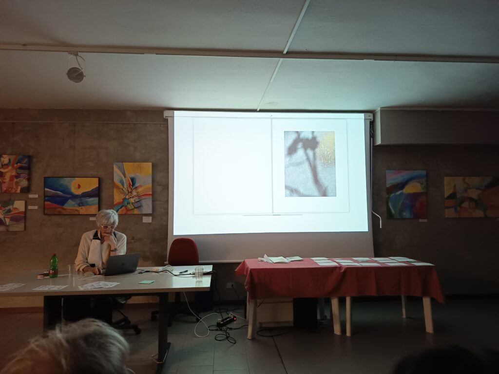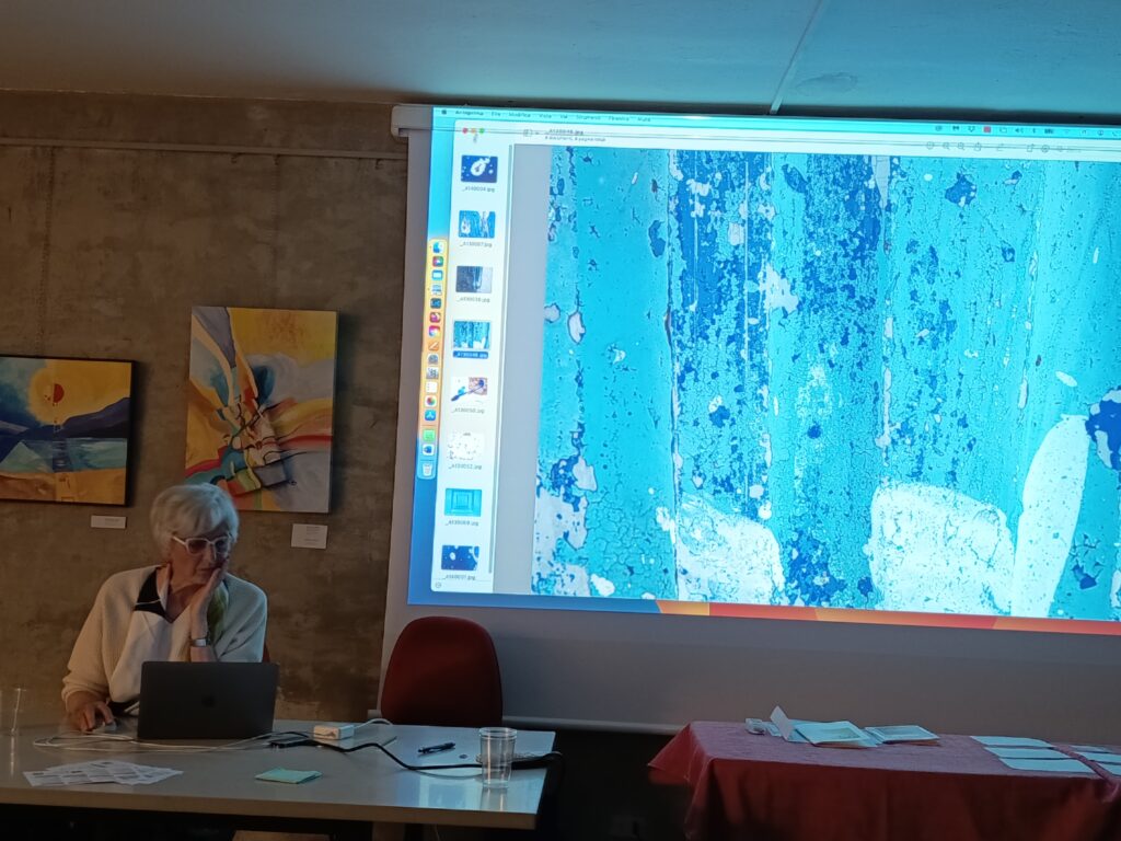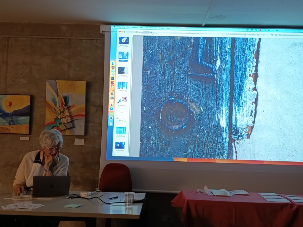 Così ci ha mostrato opere che non possiamo definire solo fotografie, ma non sono nemmeno quadri, perché queste immagini, lei non le dipinge, le ricava evidenziando piccoli particolari di opere pittoriche, o ingrandendo riflessi, oppure esplorando screpolature di superfici; insomma, indaga e percepisce le atmosfere dei luoghi, fino ad entrare in intima relazione con essi.