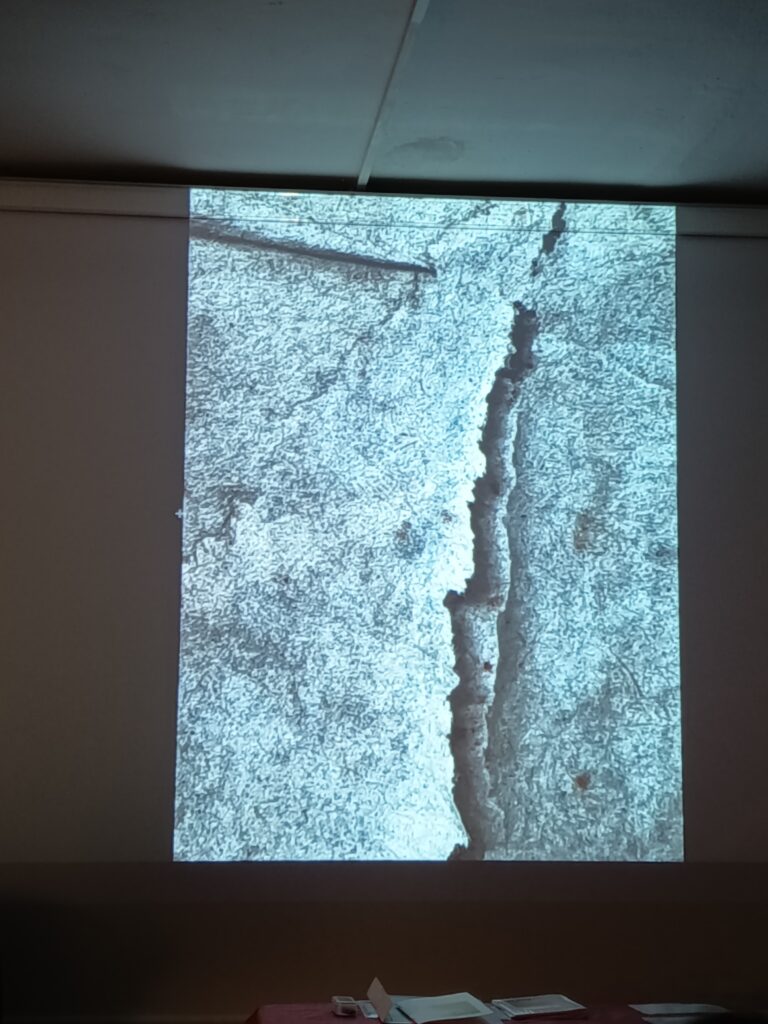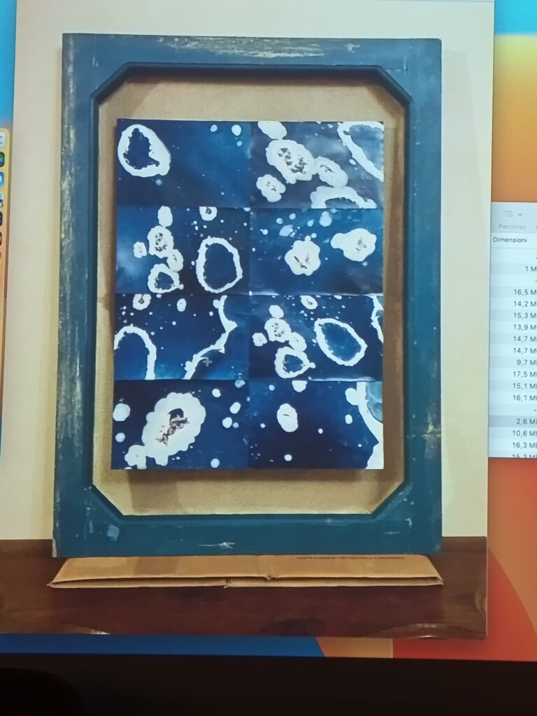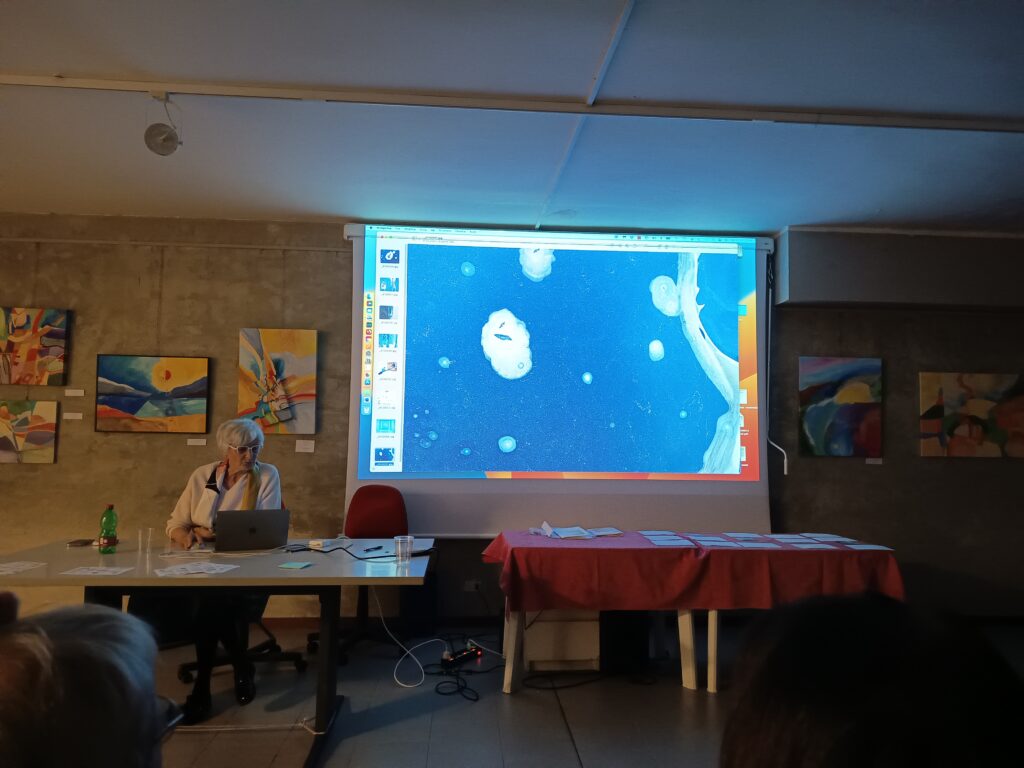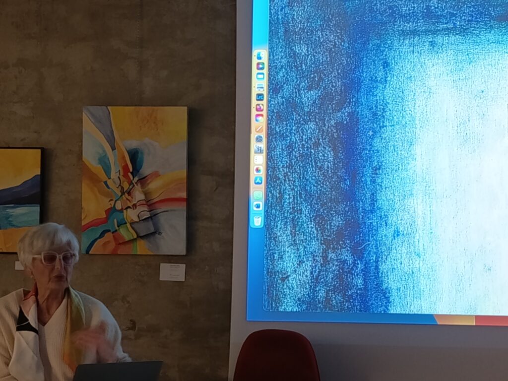 Così ci ha mostrato opere che non possiamo definire solo fotografie, ma non sono nemmeno quadri, perché queste immagini, lei non le dipinge, le ricava evidenziando piccoli particolari di opere pittoriche, o ingrandendo riflessi, oppure esplorando screpolature di superfici; insomma, indaga e percepisce le atmosfere dei luoghi, fino ad entrare in intima relazione con essi.